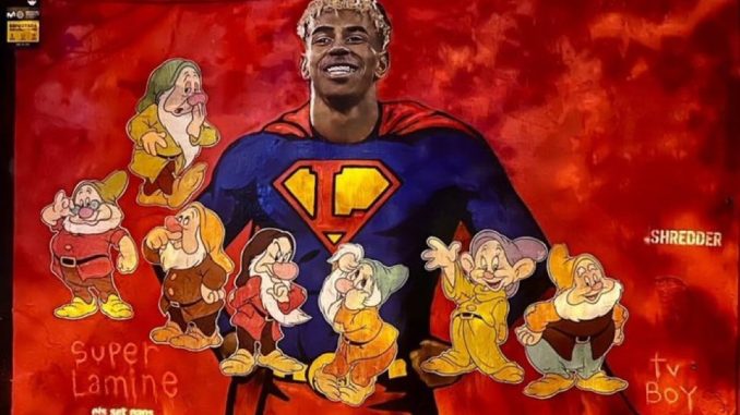 O frescă destul de cunoscută cu Lamine Yamal a fost într-adevăr vandalizată. Reprezentându-l pe atacantul de la FC Barcelona în postura lui Superman, această operă, situată pe un perete din Plaça Joanic, chiar în inima Barcelonei, a fost modificată de o persoană care a adăugat cei șapte pitici din filmul de animație Albă ca Zăpada – o referință la petrecerea de aniversare controversată a lui Lamine Yamal, la care acesta ar fi angajat persoane de statură mică. Fresca a fost între timp restaurată, fiind aplicat un nou strat de vopsea pentru a șterge piticii respectivi.
